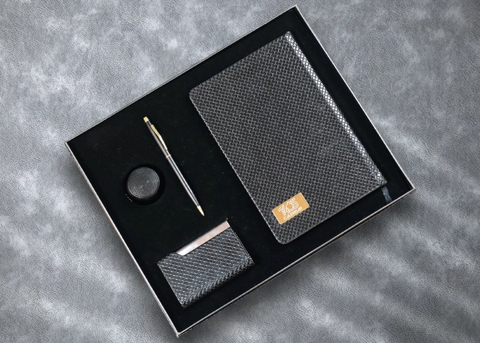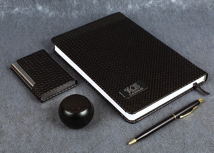 اقلام ست :اسپیکر گرد، سررسید رقعی ، جا کارتی،خودکار، به همراه بگ شاپ طلاکوب دار