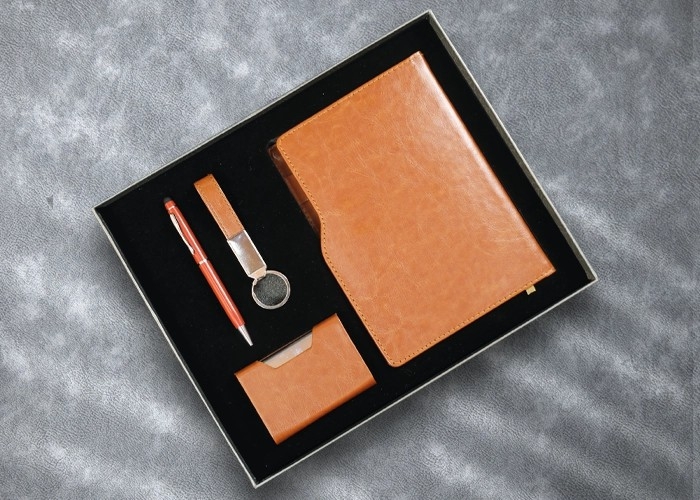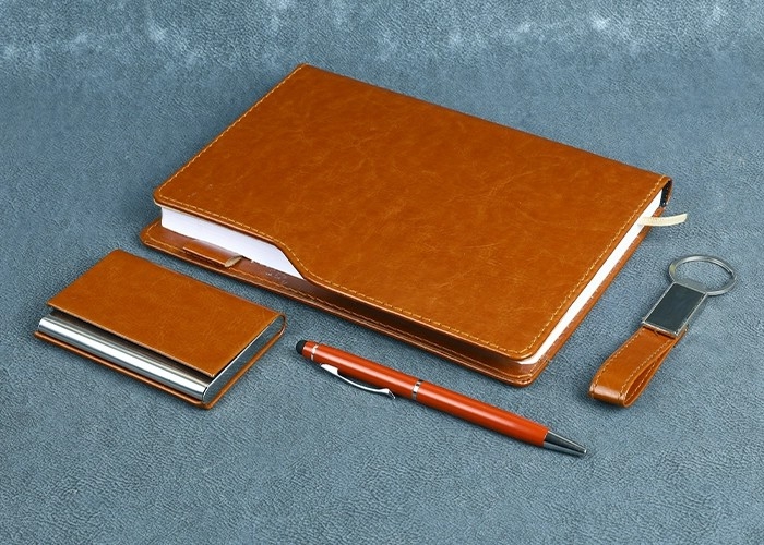 اقلام ست :سررسید رقعی ، جاکارتی ،جا سوئیچی،خودکار به همراه بگ شاپ طلاکوب دار