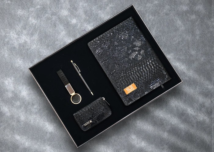 اقلام ست :سررسید وزیری،جاکارتی کیفی، جاکلیدی و خودکار به همراه بگ شاپ طلاکوب دار