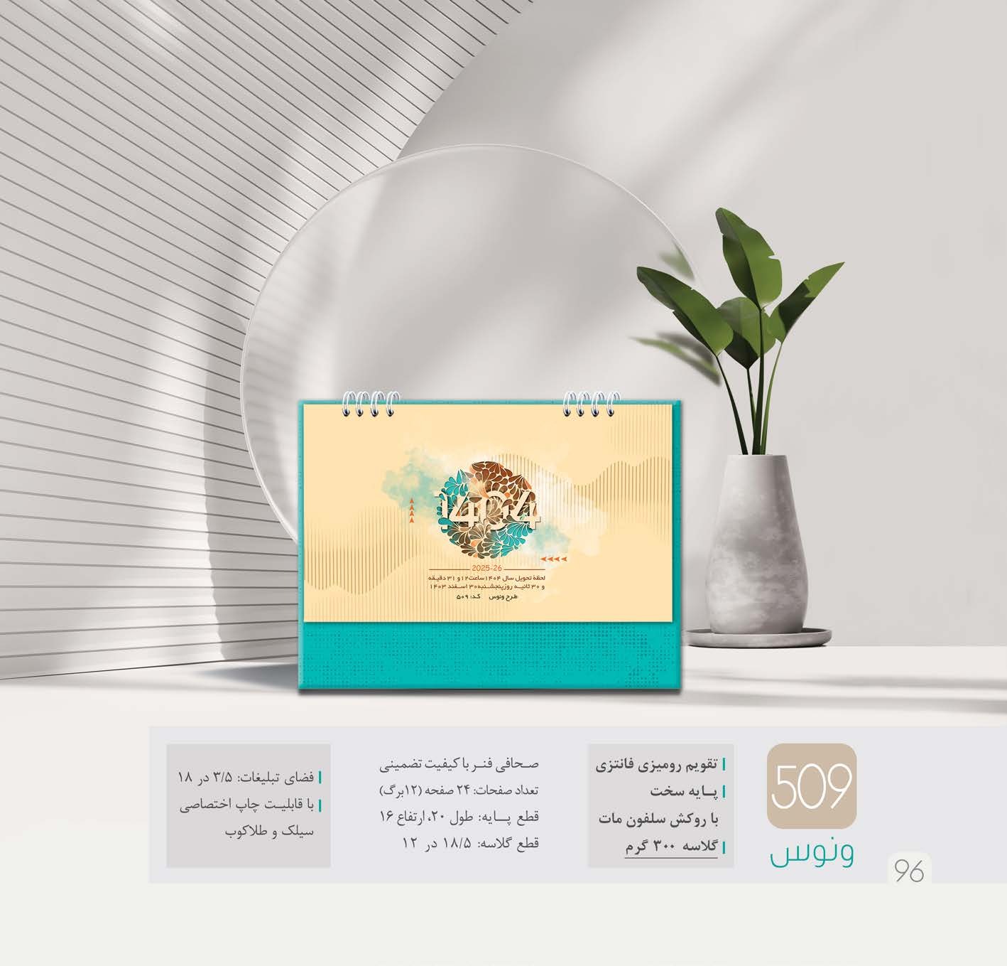 تقویم شمسی رومیزی شیک با طراحی مدرن و کیفیت بالا و تضمینی گزینهای ایدهآل برای میز کار یا هدیه های تبلیغاتی .