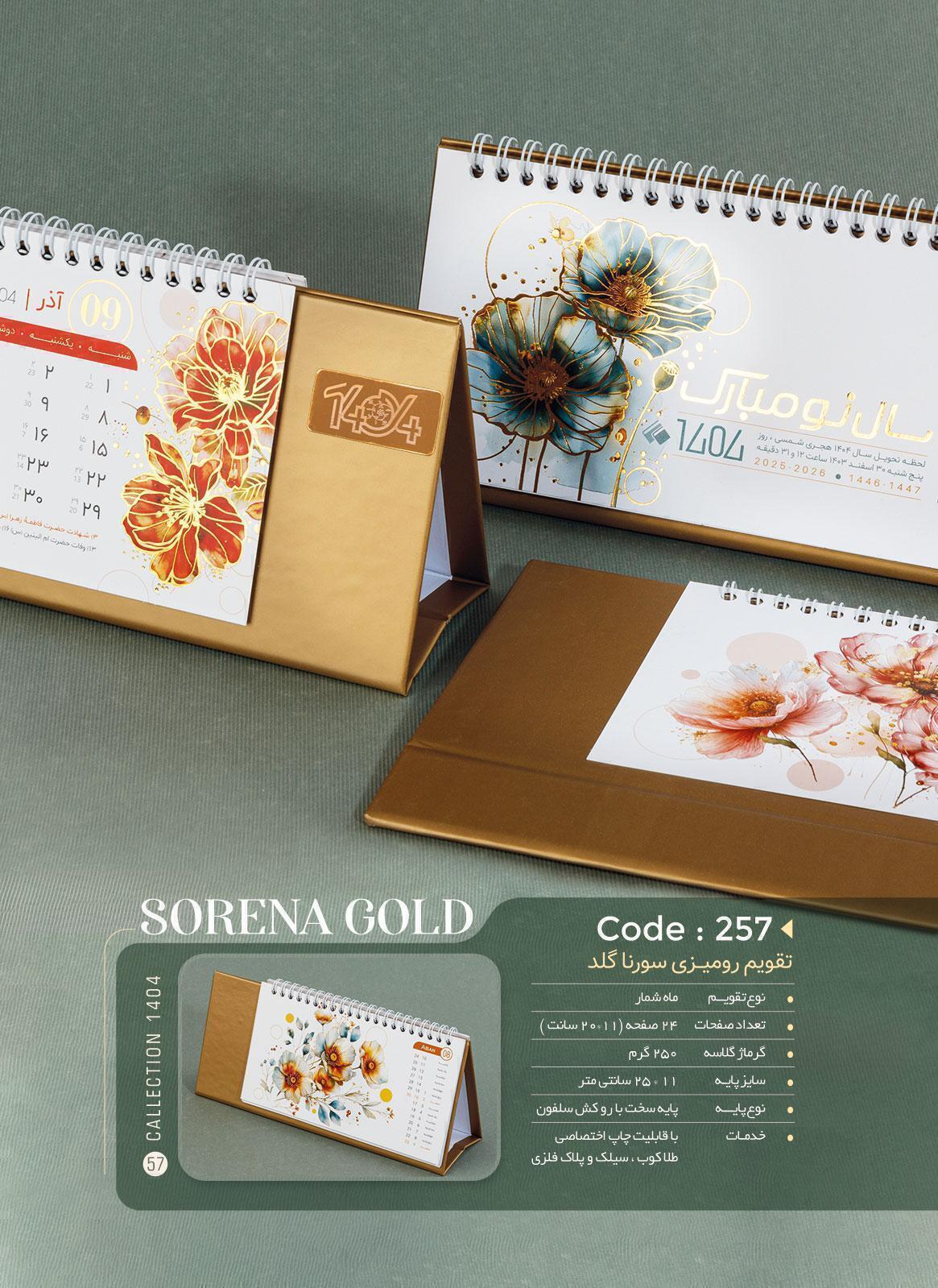 تقویم رومیزی 1404 پایه سخت با روکش سلفون مدل سورنا گلد ars-257
