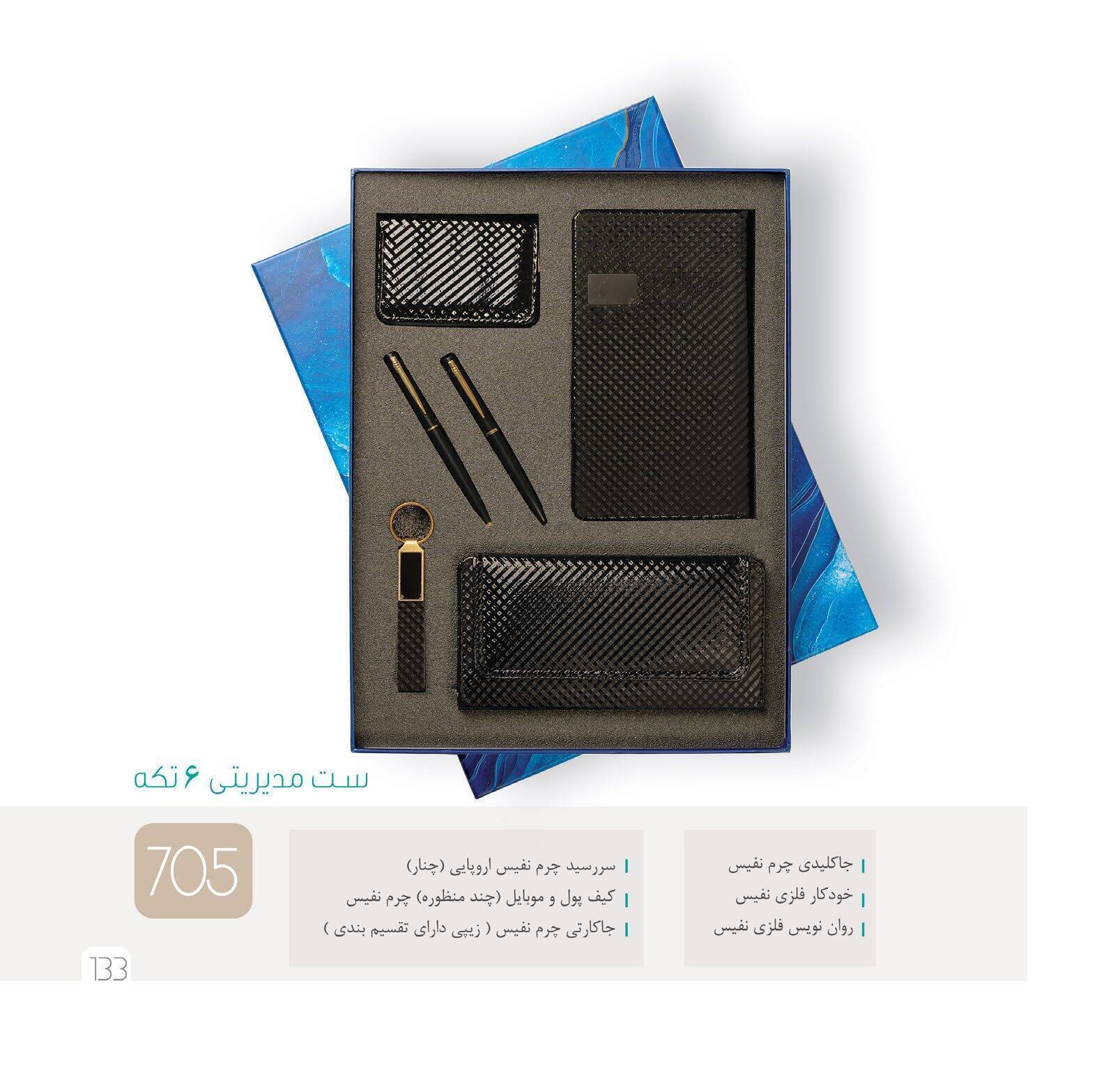 محتویات : سررسید چرم نفیس اروپایی ، کیف پول و موبایل ، جاکارتی ، جاکلیدی ، خودکار فلزی نفیس ، روان نویس فلزی نفیس