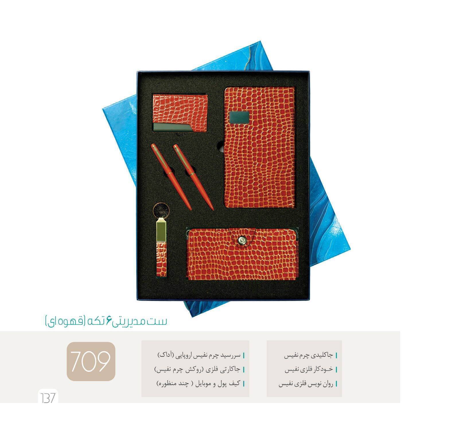 محتویات : سررسید چرم نفیس اروپایی ، کیف پول و موبایل ، جاکارتی فلزی ، جاکلیدی ، خودکار فلزی نفیس ، روان نویس فلزی نفیس