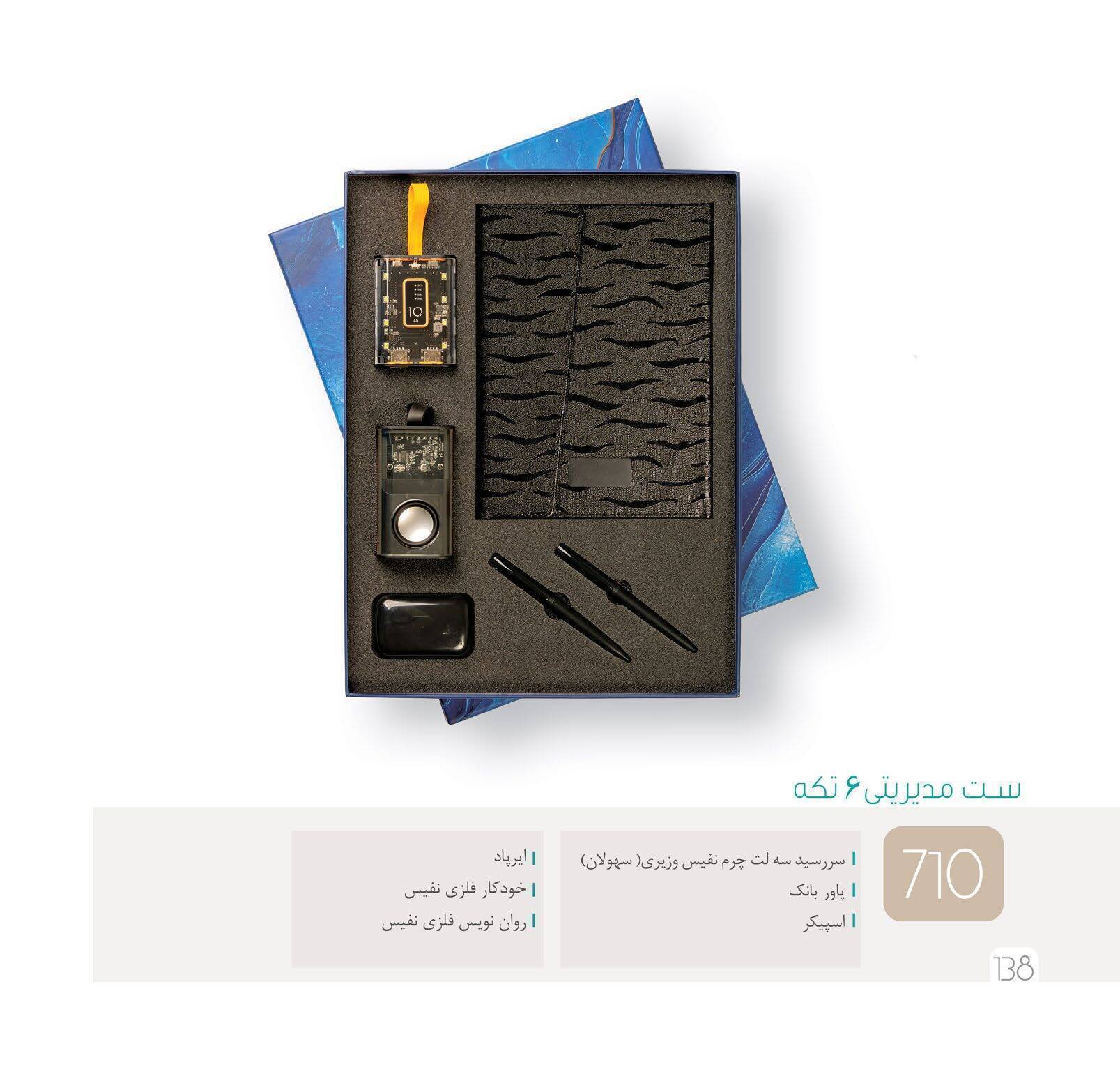 محتویات : سررسید سه لت چرم نفیس وزیری ، پاور بانک ، اسپیکر ، ایرپاد ، خودکار فلزی نفیس ، روان نویس فلزی نفیس