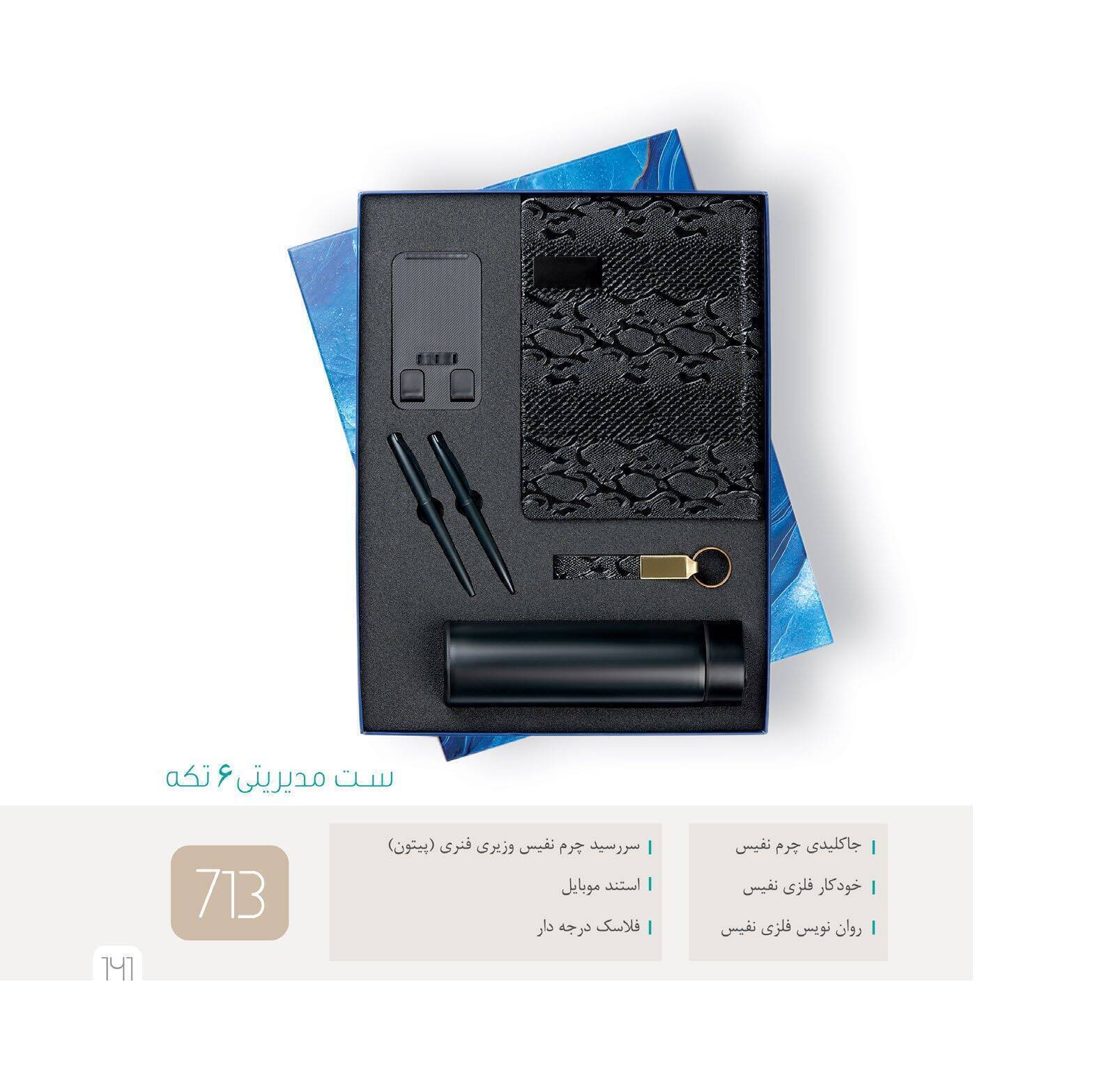 محتویات : سررسید سه لت چرم نفیس وزیری ، استند موبایل ، فلاسک درجه دار ، جاکلیدی ، خودکار فلزی نفیس ، روان نویس فلزی نفیس