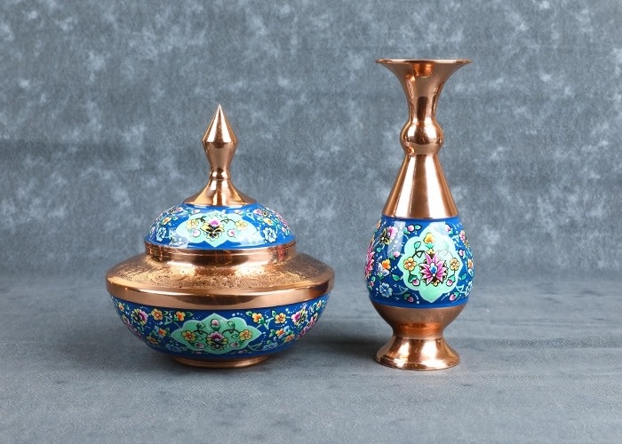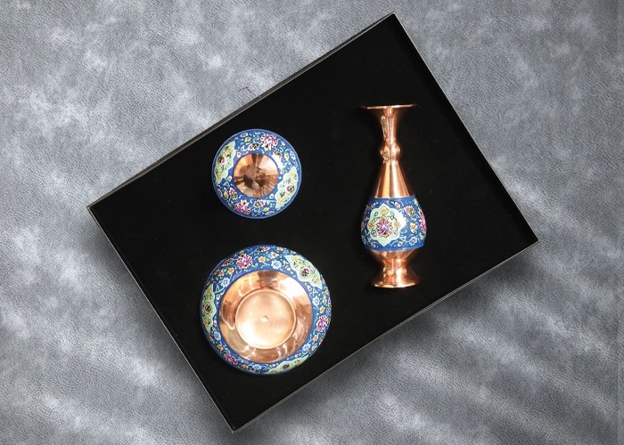 اقلام ست :شکلات خوری مسی سلجوقی، یک عدد گلدان مسی 20 سانتی فیروزه به همراه بگ شاپ طلاکوب دار