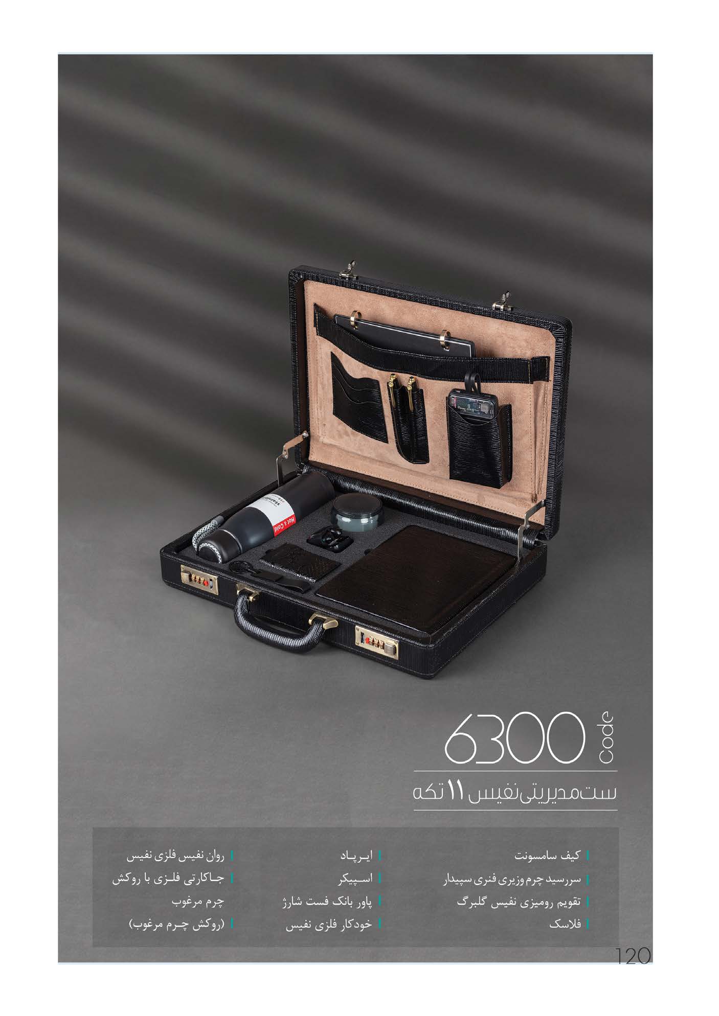 کیف سامسونت،سررسید چرم وزیری فنری سپیدار،تقویم رومیزی نفیس گلبرگ،فلایک،ایرپاد،اسپیکر،پاور بانک فست شارژ،خودکار فلزی،جاکاراتی فلزی،چرم مرغوب