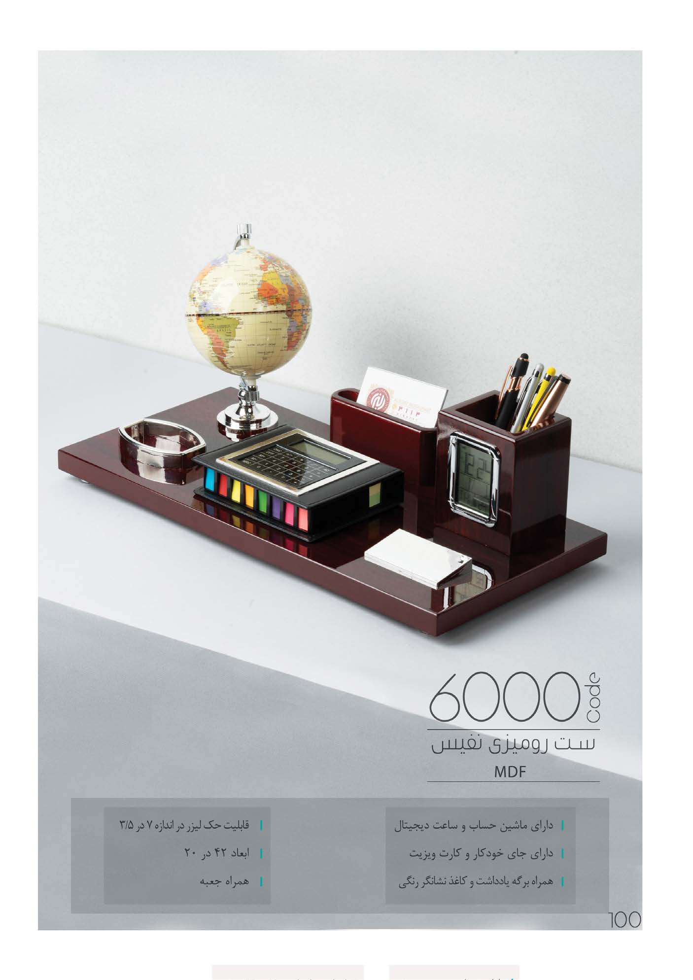 دارای ماشین حساب و ساعت دیجیتال،دارای جا خخودکار و کارت ویزیت،همراه برگه یادداشت و کاغد نشانگر،قابلیت حک لیزر در ابعاد 7 در 3/5 همراه جعبه