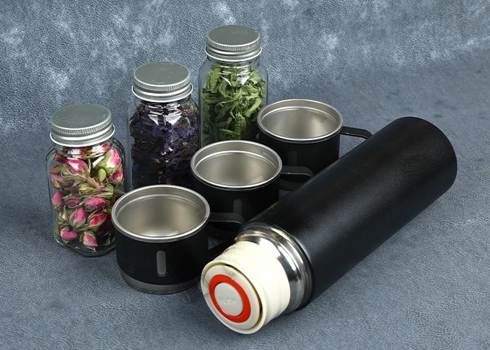 اقلام ست : فلاسک سه کاپ ، شیشه کشیده سه تایی دمنوش به همراه بگ شاپ طلاکوب دار